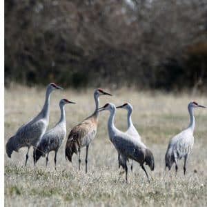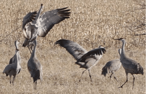 While in the fields feeding, they can be seen performing their well known “dance of the cranes.” Mated pairs will bow to each other with outstretched wings, leaping high off the ground. They may grab sticks or corn stubble and repeatedly toss it into the air during these displays. This courtship is believed to strengthen the pair bond between mates. Sandhill Cranes are monogamous, remaining together for life which can be well over 25 years. But Sandhill Cranes are confronted by many obstacles.