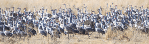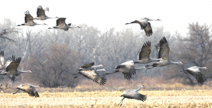 The common name, Sandhills Crane, is derived from its relationship with the Platte River surrounded by the Nebraska sandhills. This region is an important annual migratory stopover for up to 1 million Sandhill Cranes. 15% of that population are intermediate, or Sandhill Cranes which nest in Canada, 5 % are Greater Sandhill Cranes, and the balance are Lesser Sandhill Cranes. The Sandhill Cranes that pass through the heart of Nebraska known as the Central Flyway, winter in Texas, New Mexico, and Mexico. The normal arrival date in Nebraska on their way north is late February.