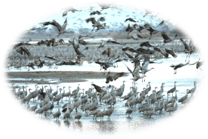 When the cranes head for the river to roost, they arrive in lose flocks scattered across the sky. As they land on the water it appears as if a large feathered raft is being created. But in the morning as the sun rises a nervous anticipation spreads through these massive groups of cranes scattered up and down the river. Then, all of a sudden as if on cue, thousands of cranes ascend into the air with a unified shattering sound of calls and wing beats. It is repeated up and down the river until the sky becomes a shadowy mass of cranes spreading out to select a field where they will spend most the next 8 to 10 hours feeding, loafing, and interacting between family members and with their neighbors.