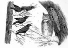 Crows have the ability to work together. These intelligent Corvidaes can devise solutions to solve problems. They can recognize new and sometimes unusual sources of food. Crows can become a bother to some people as they’re resourcefulness can lead to large flocks around dumpsters, landfills, and at roosting sites, yet others are fascinated by them. They will also work together to drive off predators and large raptors, especially Great Horned Owls, a behavior known as mobbing. These owls appear to take some vicious attacks and for good reason. The Great Horned Owl is perhaps the only major threat to the Crow’s existence other than humans. Great Horned Owls will silently swoop in and take a Crow in the dark if it is noisy or perhaps stretching while roosting. The darkness of night is the owl’s revenge for the daylight attacks. And since a Crow weighs more than a pound, it is a substantial and easy meal for a Great Horned.
