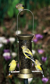 Thistle feeders are specialized bird feeders for attracting Goldfinch, House Finch and Indigo Buntings. During the winter months they are also a favorite of Pine Siskin and Purple Finch. The seed used in these feeders is limited to Nyjer thistle or a finch mix. Caution should be taken to assure the thistle seed is fresh. Nyjer thistle is not a true thistle but a coreopsis imported from India and Ethiopia. Once it reaches the United States it is sterilized by the USDA prior to distribution to prevent germination or the introduction of non-native plants. This sterilization process creates a shelf life of 4 to 6 months, after which the finch will ignore it when put in a feeder. If using a finch mix avoid those containing canary grass seed, flax, and other fillers. The best finch mix is half Nyjer thistle and half ground sunflower chips.