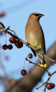 Wingtips: Berry producing shrubs and trees can entice Cedar Waxwings into your yard along with a number of other interesting songbirds. A few plants readily available that attract these birds are: serviceberry, strawberry, mulberry, dogwoods, raspberries and various Viburnums. Crabapple, junipers, mountain ash and Washington Hawthorns are berry producing trees these birds will flock to. Combined with a source of fresh water you’ll be delighted by the variety of songbirds you attract along with the Cedar Waxwing.