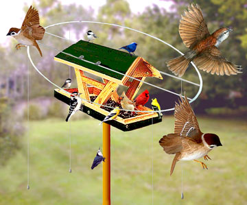 The Magic Halo: Developed and patented by the University of Nebraska this is a device that can be used in two separate manners. The “Magic Halo” itself, when used in conjunction with either a post mounted or hanging feeder will deter up to 86% of the English Sparrows from that feeder with no affect on the remaining species of backyard birds. With mono-Filament lines added to the “Halo” at four comers extending below the perches, the elimination of English Sparrows from the feeder exceeds 99%. (Wires are just as effective and are safer in preventing birds from becoming entangled) The Magic Halo also has a profound affect on Blue Jays as well as the common Grackle. The addition of lines to the “Magic Halo” has little affect on other birds and even acts as a haven for such species as Finches, Chickadees and others. If the lines extend to the ground and where they can be staked down, house sparrows will avoid feeding under the bird feeder as well.