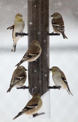 enjoying the Northern population of Goldfinch over the winter months. Our resident Goldfinch, many who drift south for the winter, will be returning this month, usually by the second week of March. It is easy to double the numbers of goldfinches at the feeders from late winter to early summer. March is the month when the olive drab feathers of the male Goldfinch will be replaced with the bright canary yellow feathers. At first the male Goldfinch will appear blotchy until the full beauty of his breeding plumage is revealed. It will be May before the northern populations we have enjoyed begin to follow the dandelion bloom back to their breeding territories. At that time we will be left with our resident population of goldfinches. This might be a good time to add another thistle feeder to avoid over-crowding.