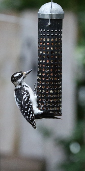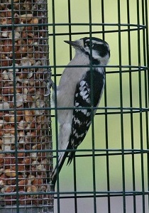 While Downy Woodpeckers are much more common and not near as timid as the Hairy, they both occur in backyards at suet and peanut feeders.