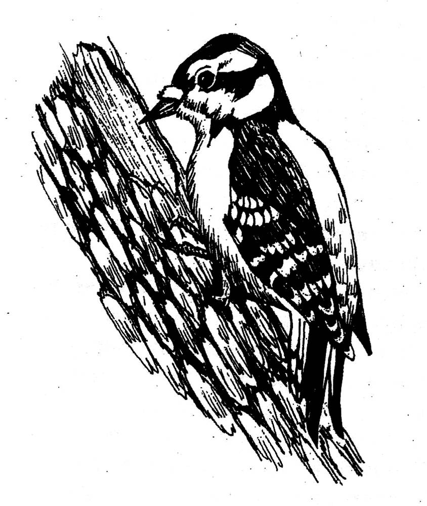 By late winter or early spring, the mating urge of the male Downy gets serious and these birds will begin to defend a loose nesting territory. Once a mate has been selected they will begin to look for a nesting site. When a site is located, and if the nesting tree is agreed upon, the defense shifts to a small range with the nest as the focal point. There are times when they don’t agree on a nest tree and they simply split up and do not nest together but attempt to find another partner. However, providing all goes well, the male will excavate a new hole, but only in a dead branch or tree trunk. This event takes 5 to 7 days to complete after which the female will then lay 4 to 5 eggs. Incubation will usually start at the completion of the clutch. The pair will trade off on incubation duties, with the male working the night shift. The eggs will hatch in about 12 days, and both parents will brood the young in the nest for about 2 weeks. Again, the male has the overnight watch, but both share in the feeding process. The youngsters fledge about three weeks after hatching and can fly immediately. One feature of interest is if you find an active Downy nest you can tell the age of the young inside. For the first 9 days the adults disappear completely into the nest when feeding. After that and until about the 14th day, you will see the tail of the adult sticking out of the nest hole while transferring food to the chicks. From then on until they fledge the young will meet the adult at the entrance for their food. Both adults will continue to feed the fledglings for several more weeks until the feeding becomes almost confrontational. It is thought this may trigger the separation of the family.