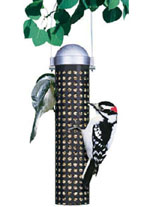 not only the most common and prevalent woodpecker in this area, but is also the smallest of our North American woodpecker species. Adults are mainly black on the upper parts and wings, with a white back, throat and belly, and white spotting on the wings. There is a white bar above and below the eyes. They have a black tail with white outer feathers that are barred with black. Adult males have a red patch on the back of the head. The male can be distinguished from the female at any age by this red patch. The female Downy is strictly black and white. You probably know by now how easy it is to attract them to suet feeders, and bird feeders stocked with sunflower or peanuts. They are very trusting of humans. One can easily approach them while they are visiting the feeding stations. They look very much like a distant relative of the Hairy Woodpecker and are virtually identical in plumage pattern, but these two species are not closely related at all. In fact the Downy Woodpecker is more closely related to the Ladder-back species which is found in the southwest part of the country. The most noticeable difference between the features of the Downy and Hairy Woodpeckers is the Downy is smaller in size by 3”, and a beak half the size of their head. The Hairy’s beak is as long as its head. It is certainly interesting to note that these two species exploit rather differently-sized foodstuffs and generally do not compete very much ecologically. They may however battle over who has the right to the suet feeder.