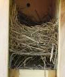 Bluebird nest is very elegant and clean, constructed of fine grasses in a uniform cup shaped bowl. A similar nest if lined with feathers is that of a Tree Swallow. A nest of entirely small twigs is the House Wren. Chickadees build a taller nest of fine grasses and moss and will conceal the eggs under mosses and grass when away from the nest. House Sparrows on the other hand build nests out of a variety of mixed materials. They will pack the box completely full of coarse grasses, many with the seed heads still attached, bits of paper, plastic, and other debris and create a dome over the top. If you find a nest of mixed materials and grasses with seed heads, its best to remove it. This will keep the nest box available for bluebirds. It is important to monitor the nest box to evict House Sparrows and check on nesting bluebirds. Once the young bluebirds have fledged, clean out the old nest. This will encourage the bluebirds to nest a second time.