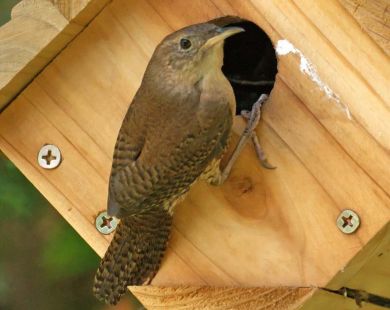 • House Wrens nest inside tree holes and nest boxes. As the season progresses their nests can become infested with mites and other parasites that feed on the wren nestlings. Perhaps to fight this problem, wrens often add spider egg sacs into the materials they build their nests from. In lab studies, once the spiders hatched, they helped the wrens by devouring the nest parasites.