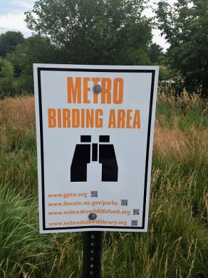 Thanks in part to a Watchable Wildlife Grant from the Nebraska Game and Parks Division’s Wildlife Fund, our expanding network of hiking and biking trails now sport signage identifying “Metro Birding Areas”. The Great Plains Trail Network (GPTN) made application for the grant, and was announced as a recipient in December. GPTN partnered with the City of Lincoln, which provided sign installation, and the Wild Bird Habitat Store (Recipient, Better Business Bureau’s “Integrity Award” for 2012) which supplied matching funding along with GPTN.