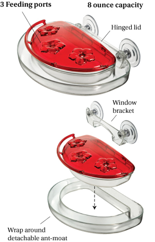 Hummingbirds are affectionately referred to as Nature’s Jewels because of their iridescent qualities and beauty. The Jewel Box Window Feeder allows you to bring these beautiful birds up close for viewing. The bright red cover will attract hummingbirds. Once there the HighView™ perch invites them to rest comfortably as they drink from any of three feeding ports while also offering an unobstructed view of the birds. You can use this feeder with or without the ant moat to block crawling insects. Features a generous 8 oz. capacity, sturdy polycarbonate construction, and a suction cup mounted bracket.