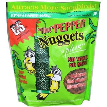 Contains rendered beef suet, roasted peanuts, red chili peppers, corn, and oats. Keep the Squirrels away! Hot Pepper Nuggets “plus” can be fed alone on a platform feeder or Nugget/Peanut feeder.