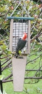 5/8″ Poly-lumber made from recycled plastic and milk jugs. Lifetime guarantee to never crack, split or fade. Stainless steel screws. Green roof w/taupe base. Vinyl coated grid. 29″ hanging cable. Holds 2 suet cakes.