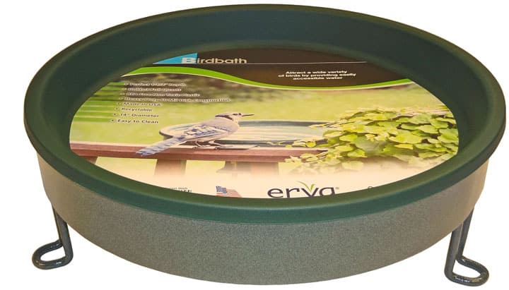 14 inch durable polypropolene bowl sets in a powder coated steel base. This light weight unit makes it ideal for decks and patios. The non-porous bowl cleans easily and withstands extremely cold temperatures. May use with any bird bath heater or de-icer, or use the 14 inch heated Erva insert during the winter. (Sold Seperately) Weight: 4 lbs.