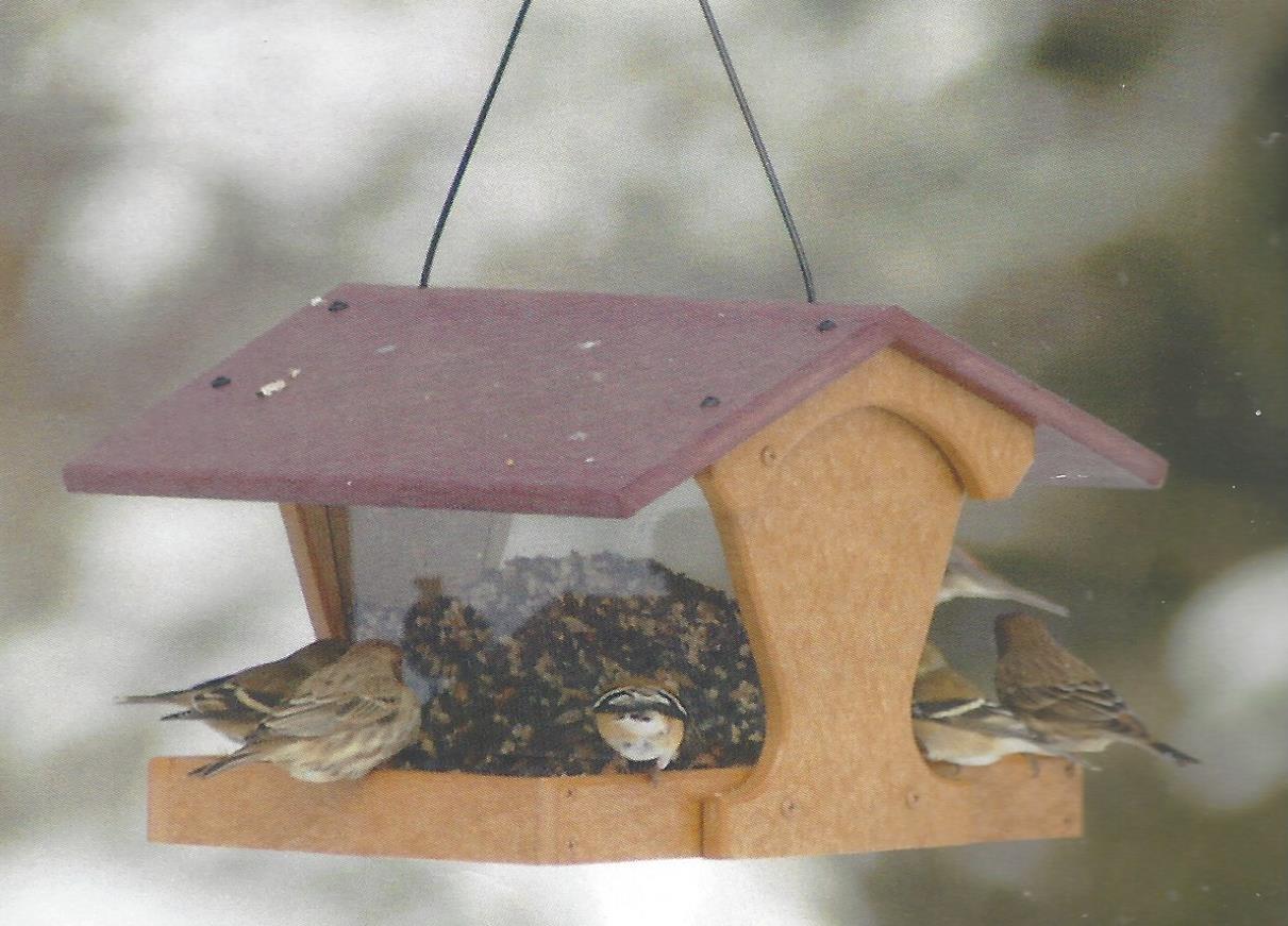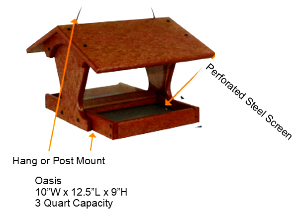 This hopper bird feeder is a step-up from the Little Oasis holding 3 quarts of wild bird feed. Made with poly-lumber from 100% recycled post consumer products. Heavy duty acrylic inserts A plastic coated steel braided cable for hanging that is durable and long lasting. Best of all is the rust free steel mesh bottom. Rain flows thru keeping seed dry and it is removable for easy cleaning. The Wild Bird Habitat Stores are proud to carry Hill Top Specialty products made in the U.S. by a family owned Amish business in Indiana. Hill Top Specialties pride themselves in quality workmanship, guaranteeing all their products.