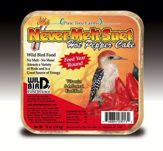 Peanuts, corn, Rendered beef suet, Chili Pepper, Vitamins & Mineral. 12 oz Suet Hot Pepper Cake. Hang in your yard to attract a variety of birds. Never Melt Suet Hot Pepper 12 oz. Pine Tree Farms Never Melt Suets are produced with some of the finest ingredients in the world, (no artificial pellets nor artificial berries) making these Never Melts the best in the world. Pine Tree Farms has a special formula that creates a never melt suet that is unmatched by anybody in the business. It will not crumble and can withstand temperatures of over 120 F. They are vitamin fortified and are best for spring/summer feeding. It is a great source of energy YEAR ROUND.