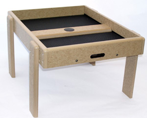Recycled taupe poly-lumber w/2 removable powder coated perforated steel seed trays for easy cleaning. 5/8” Poly-lumber made from recycled plastic and milk jugs, lifetime guarantee to never crack, split or fade, stainless steel screws. Keeps seed off the ground and dry. Attracts ground feeding birds. May be used with pole through center hole as a seed catcher under a hopper feeder to catch seeds and hulls.