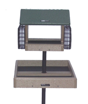 Recycled taupe poly-lumber w/2 removable powder coated perforated steel seed trays for easy cleaning. Great post mounted platform bird feeder or mount on a pole under a hopper or use as a feeder. Mounting flange sold separately. 5/8” Poly-lumber made from recycled plastic and milk jugs, 20 year warranty to never crack, split or fade, stainless steel screws. Mount on a pole under a hopper feeder to feed and catch seeds and hulls.