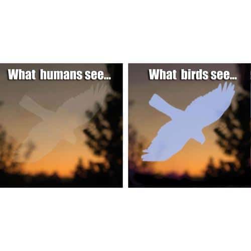 Millions of wild birds are killed each year flying into windows. Now you can help reduce this loss of life. WindowAlert is a static-cling decal that is easy to apply and peel off glass. Use Window Alert decals on home and office windows. Each decal contains a component which brilliantly reflects ultraviolet sunlight. This ultraviolet light is invisible to humans, but glows like a stoplight for birds. Birds have vision that is up to 12 times better than that of humans. WindowAlert decals help birds “see” windows and thus avoid striking the glass.