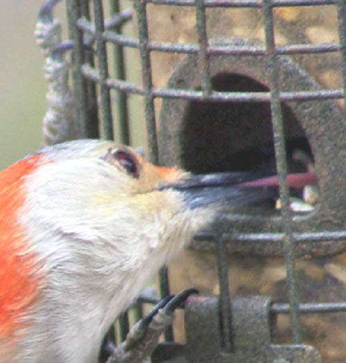 In southern regions Red-bellied Woodpeckers seem to prefer sweeter foods like oranges or tree sap from the wells dug out by Sapsuckers. In northern areas they will occasionally feed on orange pulp and grape jelly set out for orioles, but their main interest seems to focus on insects, peanuts, and natural ripening fruits like Mulberries which many birds enjoy. This woodpecker is among those birds which will cache food away for future use. They like to hide corn, sunflower seeds, safflower seeds, and of course their favorite, peanuts, stashing these morsels in the bark of a tree, in an old fence post, and even under shingles on a house.