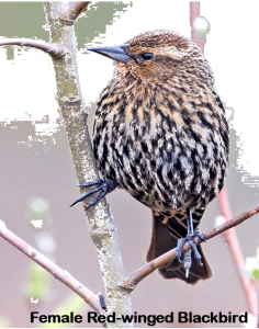 The male Red-winged Blackbird is dark glossy black with boldly colored shoulders patches of deep red and yellow. However the females are more nondescript. They are a plain, heavily streaked brown bird with a whitish eyebrow resembling a large sparrow or starling. The colors and patterns help them blend into the tall weedy wetland plants they nest in. Both sexes are seven to nine inches long with a wingspan up to fifteen inches.