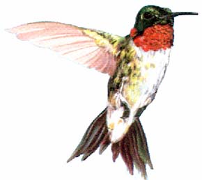 All hummingbirds are precision aerial acrobats. While flying at top speed they have the ability to abruptly stop in mid air, reposition themselves by darting up, down, sideways, and even backwards. Then, in the blink of an eye, return to top speed darting between hummingbird feeders and flowers. The male Ruby-throated Hummingbird can become very aggressive defending the flowers and feeders. Between short feeding trips he will often perch on a branch where he has a view of his conquered energy sources. If another hummingbird attempts to deprive him of his nectar it can lead to spectacular chases and aerial dogfights.