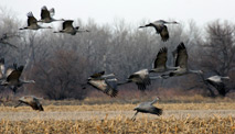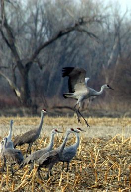 When the cranes head for the river to roost, they arrive in lose flocks scattered across the sky. As they land on the water it appears as if a large feathered raft is being created. But in the morning as the sun rises a nervous anticipation spreads through these massive groups of cranes scattered up and down the river. Then, all of a sudden as if on cue, thousands of cranes ascend into the air with a unified shattering sound of calls and wing beats. It is repeated up and down the river until the sky is becomes a shadowy mass of cranes spreading out to select a field where they will spend most the next 8 to 10 hours feeding, loafing, and interacting between family members and with their neighbors.