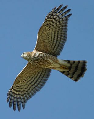 Wingtips: Other raptors which hunt birds during the winter months and may be seen hunting near backyard bird feeders are the Cooper’s Hawk and American Kestrel, our smallest falcon. The Cooper’s Hawk is very similar to the Sharp-shinned Hawk in all plumages with the exception that the Cooper is much larger at 14 to 20 inches tall. They will capture medium sized birds using a low, stealthy approach-flight or after a short chase. They will use natural cover and even manmade structures to conceal their approach. In open areas the Cooper may drop on prey from high flight.