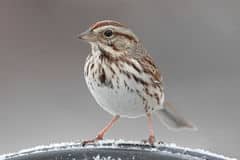 The Song Sparrow is one of our really lusty singing birds. The male perches on a prominent branch, throws back his head and lets loose with one of the most enjoyable bird calls to listen to. Some have compared this sparrow’s song with the first three notes of Beethoven’s fifth symphony. Thoreau phrased their call as if they way saying: Maids! Maids! Maids! Hang up your teakettle-ettle-etlle. Whatever your thoughts are it is a pleasant and easily recognizable song.