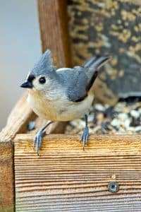 Tufted Titmice primarily feed on insects in the summer, caterpillars, beetles, ants and wasps, as well as spiders and snails, but will readily visit backyard bird feeders year round. Other natural foods include seeds, nuts, and berries. They appear to always take the largest seed or nut they can find when foraging. In the fall and winter they often hoard shelled seeds in the cracks and crevices of bark.