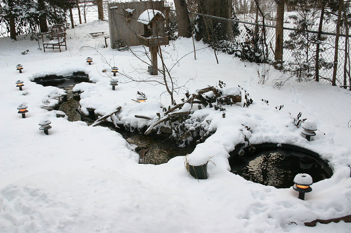 - Avian Ponds: Not exactly the season to install, but avian ponds with a meandering stream bed are probably the best year round fresh water source you can provide. With a heater placed in the reservoir it will continue to flow, even over several waterfalls, at temperatures well below zero. ( Photo left is Dave’s avian pond., an upper and lower reservoir connected, by a 16 foot bird creek with two small waterfalls. This avian pond operates even at –30 degrees