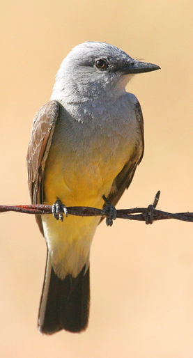 The male and female Western Kingbirds are a medium sized songbird about 9 inches long. Their head, throat and upper breast are a light gray, while the belly is a bright yellow. The wings are dark and the tail is square tipped with white outer edges. This kingbird prefers open spaces with scattered trees, shrubs, or tall man-made structures from fence posts to telephone poles. Common habitats of the Western Kingbird include grasslands, desert shrub, pasture, open savannas, and urban areas.