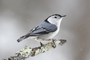 These active little birds are not very friendly with each other except during the mating season. This union of pairs may begin as early as January. The White-breasted Nuthatch is monogamous, and pairs form following a courtship in which the male bows to the female, spreading his tail and drooping his wings while swaying back and forth; he also feeds her morsels of food. The nest building often starts in April or May. The nest cavity is usually a natural hole in a decaying tree, sometimes an old woodpecker nest, and occasionally an artificial nest box intended for the Eastern Bluebird. The breeding pair may smear insects around the entrance as a deterrent to squirrels. This nest hole is usually 10 – 40 ft high in a tree and is lined with fur, fine grass, and shredded bark. The clutch is five to nine eggs which are creamy-white and speckled with reddish brown. The eggs are incubated by the female for 13 to 14 days prior to hatching and the chicks fledge after another 18 to 26 days. Both adults feed the chicks in the nest and for about two weeks after fledging. The male also feeds the female while she is incubating. Once independent, juveniles leave the adults’ territory and either establish their own territory or become “floaters”, unpaired birds without territories.