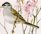 Apart from the falling leaves and temperatures, I am further made aware that we are in the midst of a seasonal change when I see the White Crowned Sparrows appearing in my backyard and at the Nature Center. They can be seen busily double scratching the ground to turn up seeds. A backwards scratch to turn over leaves to reveal seeds, then a forward hop to collect their prize. It is one of North America’s native short-range migratory sparrows that can be found across the Central Great Plains and Midwest during the winter months, showing up in our gardens and under backyard bird feeders. Their summer breeding range is across most of Northern Canada and in parts of some Western States. >In the spring, when they are moving north to their breeding grounds, they appear as if they are capped with a bridal white and charcoal black stripped helmet. In the fall, as with most all birds, the basic plumage is recognizable, but not as colorful. This stripped crown makes it one of the easiest sparrows to identify in North America.